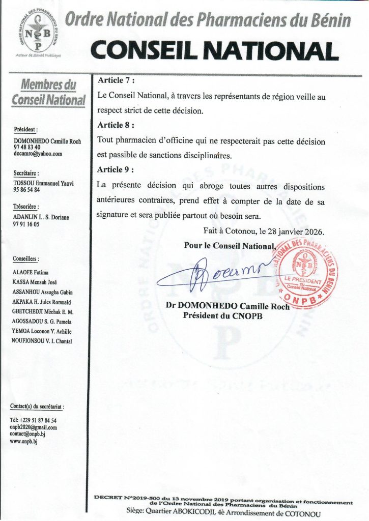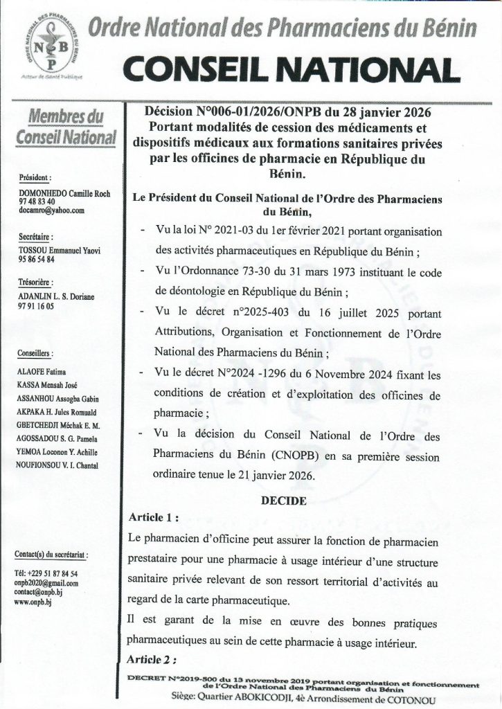 DECISION N° 006-01/2026/ONPB du 28 Janvier 2026 Portant modalités de cession des médicaments et dispositifs médicaux aux formations sanitaires privées par officines de pharmacie en République du Bénin.