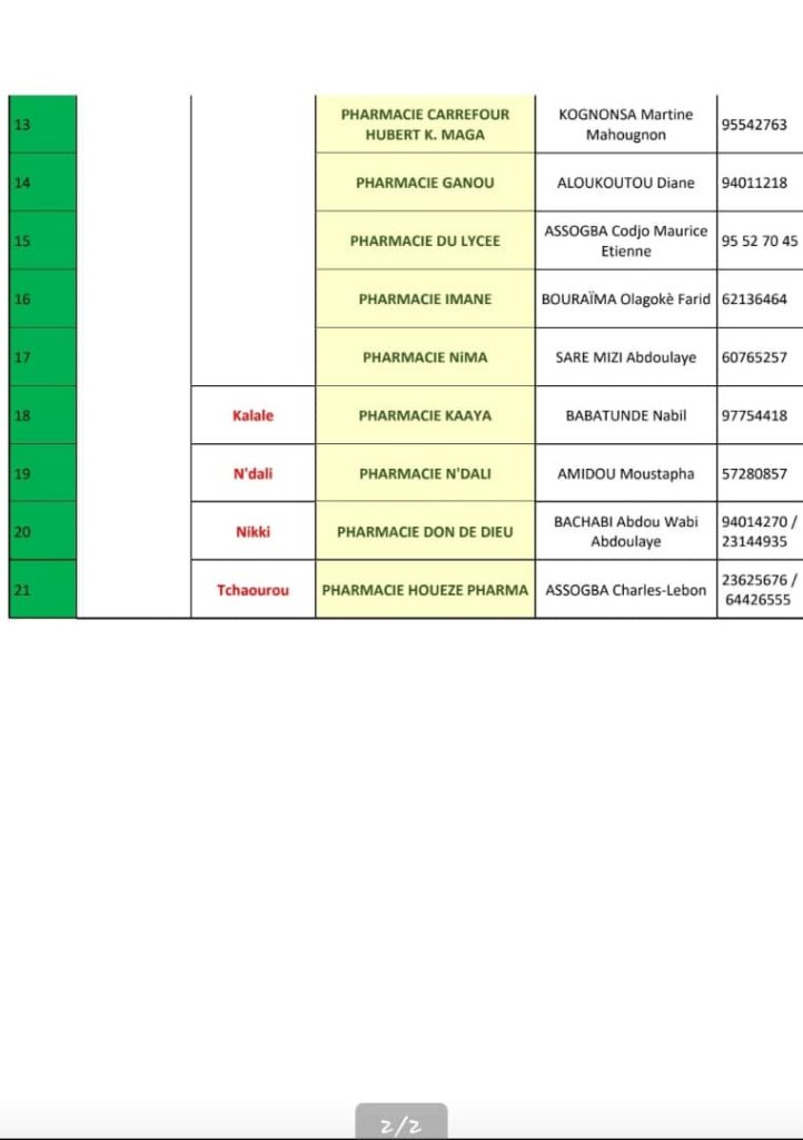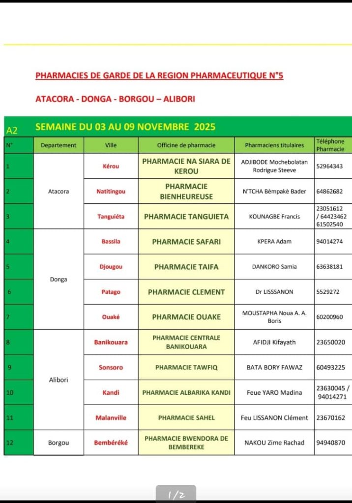 PROGRAMME DE GARDE (ATACORA/DONGA/BORGOU/ALIBORI) DU 03 AU 09 NOVEMBRE 2025