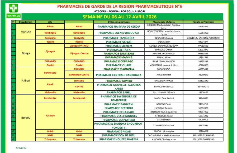 PROGRAMME DE GARDE (ATACORA/DONGA/BORGOU/ALIBORI) DU 06 AU 12 AVRIL 2026