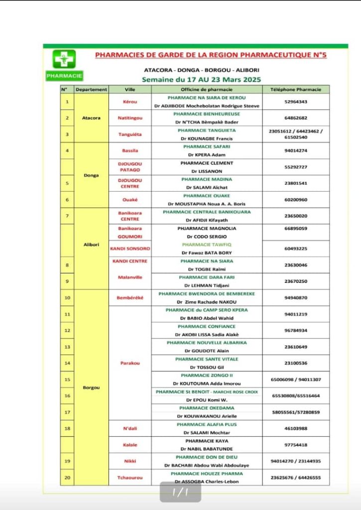 PROGRAMME DE GARDE (ATACORA/DONGA/BORGOU/ALIBORI) DU 17 AU 23 MARS 2025
