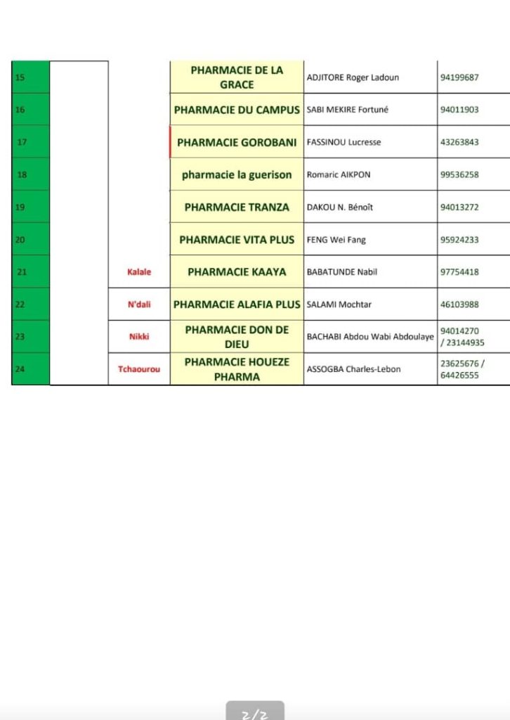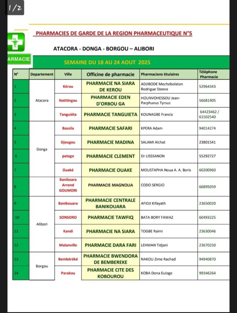 PROGRAMME DE GARDE (ATACORA/DONGA/BORGOU/ALIBORI) DU 18 AU 24 AOUT