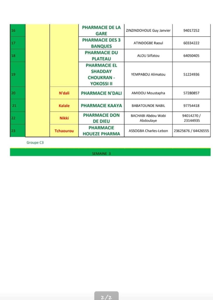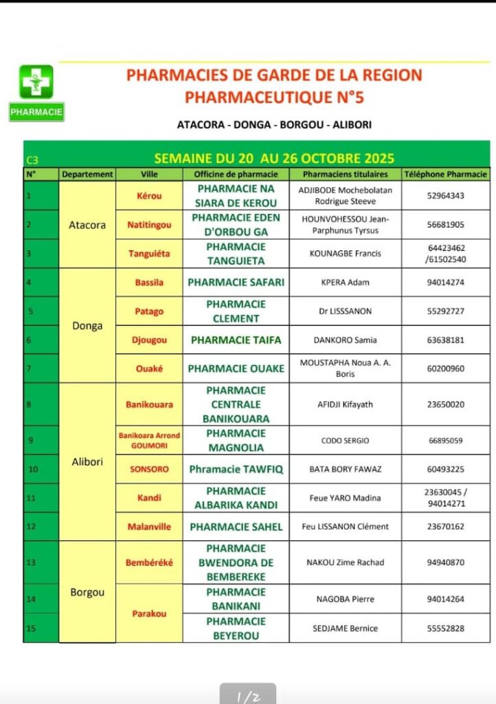 PROGRAMME DE GARDE (ATACORA/DONGA/BORGOU/ALIBORI) DU 20 AU 26 OCTOBRE 2025