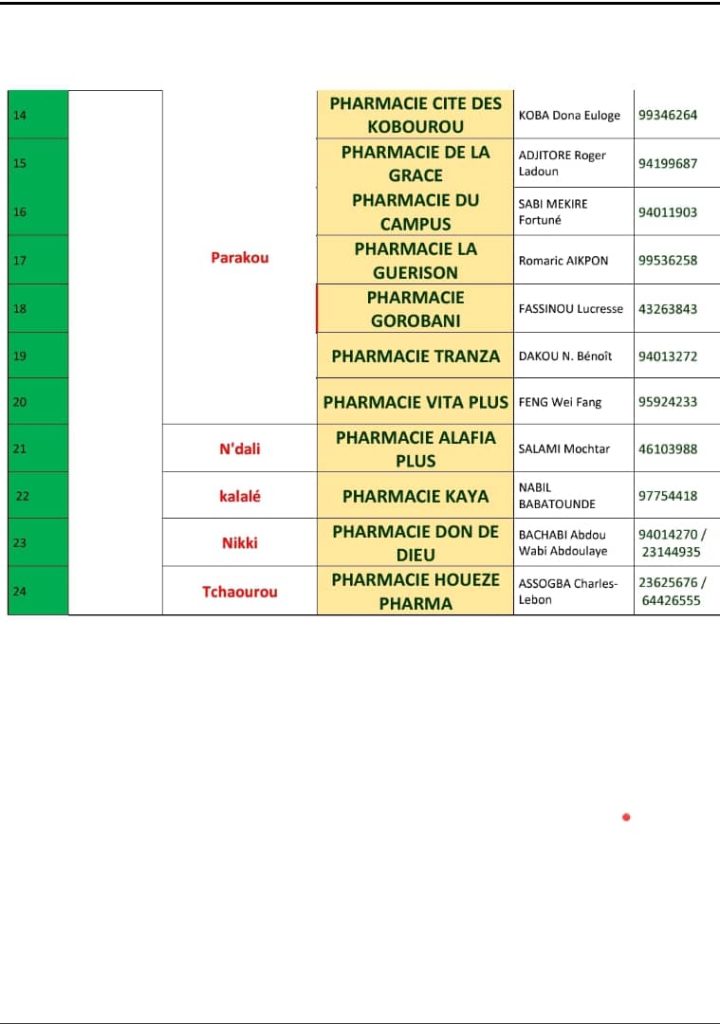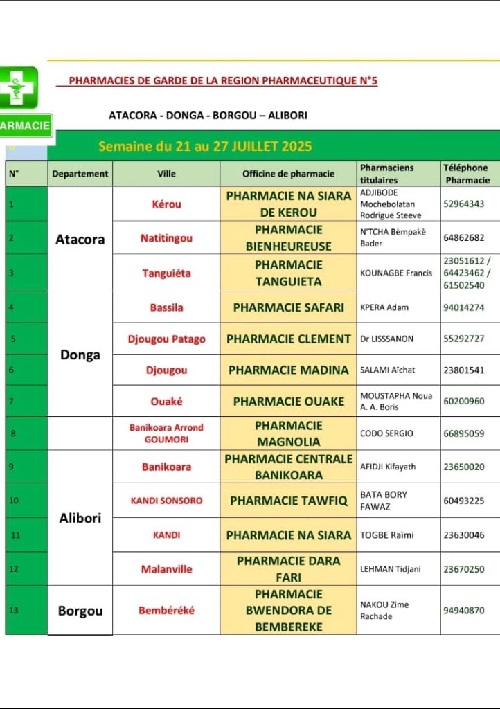 PROGRAMME DE GARDE (ATACORA/DONGA/BORGOU/ALIBORI) DU 21 AU 27 JUILLET