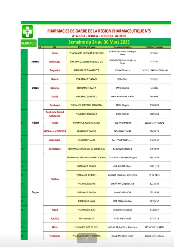 PROGRAMME DE GARDE (ATACORA/DONGA/BORGOU/ALIBORI) DU 24 AU 30 MARS 2025
