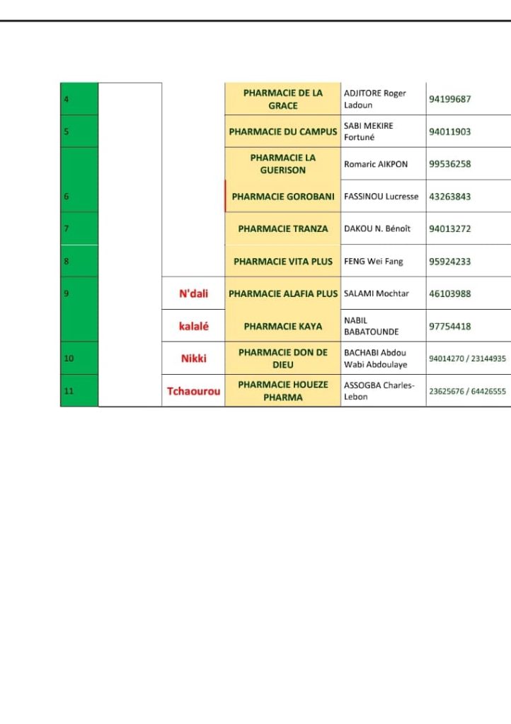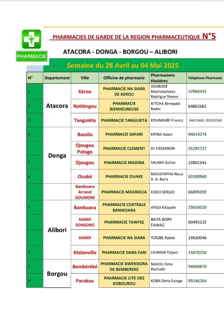 PROGRAMME DE GARDE (ATACORA/DONGA/BORGOU/ALIBORI) DU 28 AVRIL AU 04 MAI