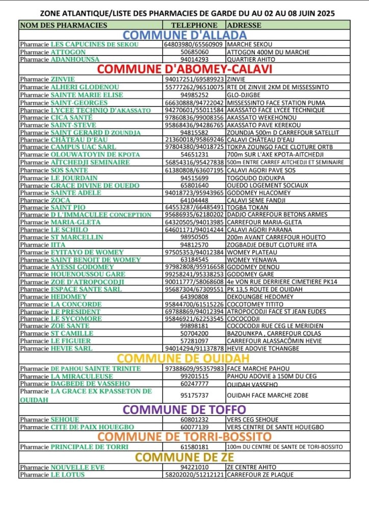 PROGRAMME DE GARDE (ATLANTIQUE) DU 02 AU 08 JUIN
