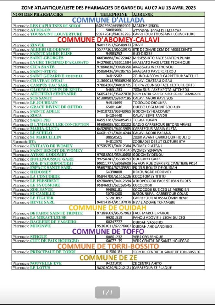 PROGRAMME DE GARDE (ATLANTIQUE) DU 07 AU 13 AVRIL 2025