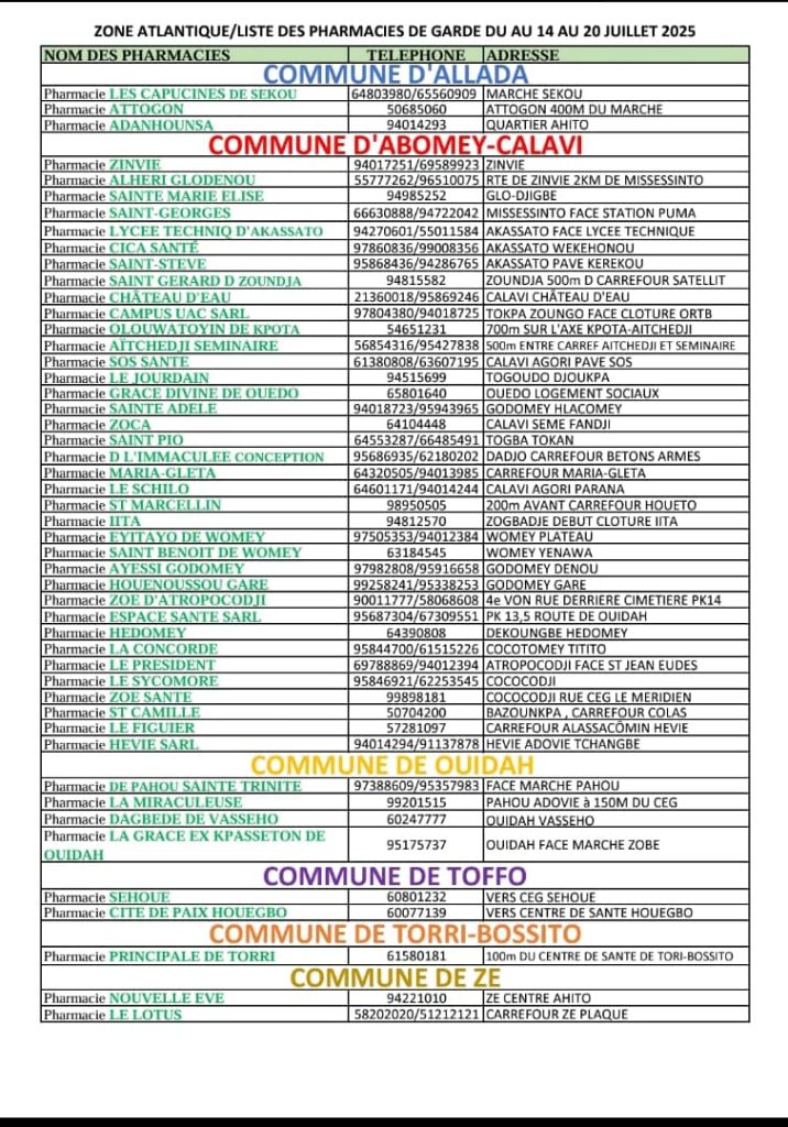 PROGRAMME DE GARDE (ATLANTIQUE) DU 14 AU 20 JUILLET