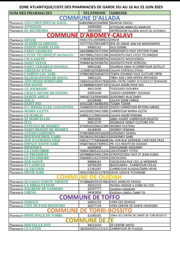 PROGRAMME DE GARDE (ATLANTIQUE) DU 16 AU 22 JUIN