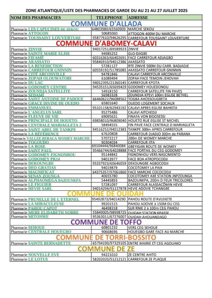 PROGRAMME DE GARDE (ATLANTIQUE) DU 20 AU 26 AVRIL 2026