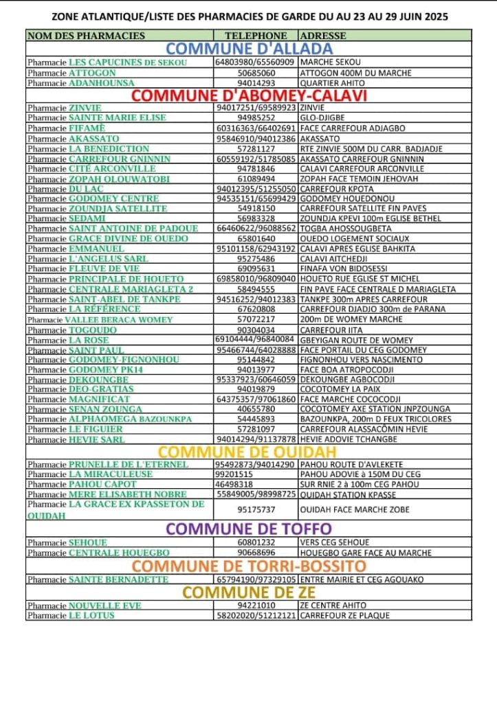 PROGRAMME DE GARDE (ATLANTIQUE) DU 23 AU 29 JUIN