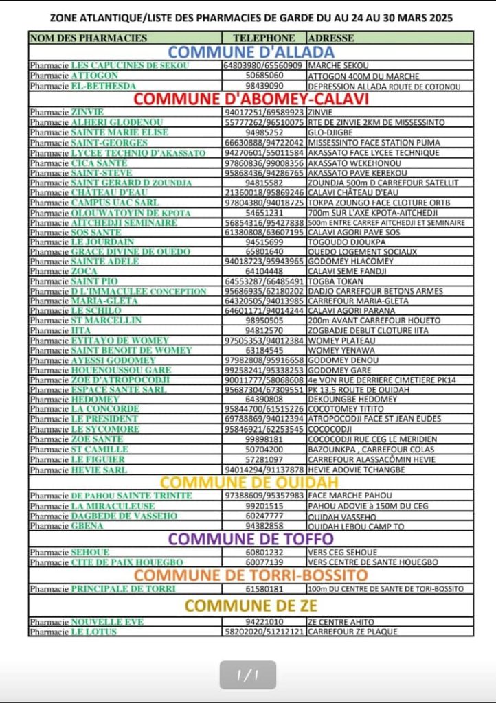PROGRAMME DE GARDE (ATLANTIQUE) DU 24 AU 30 MARS 2025
