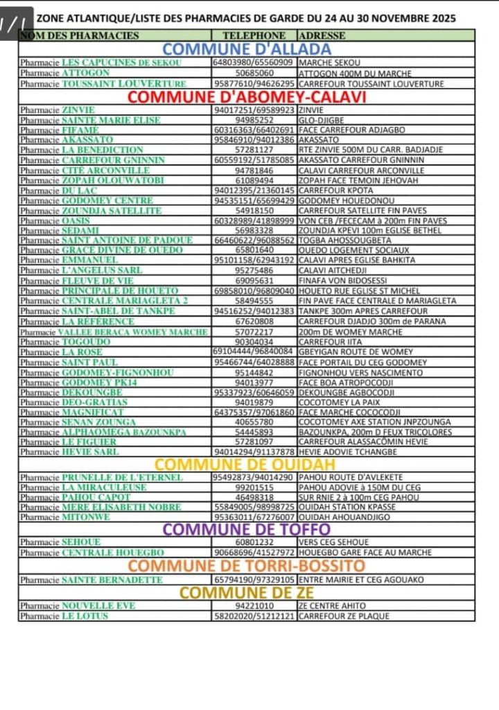 PROGRAMME DE GARDE (ATLANTIQUE) DU 24 AU 30 NOVEMBRE 2025