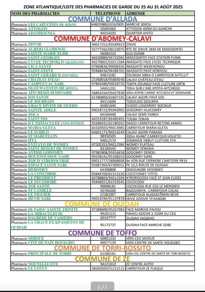 PROGRAMME DE GARDE (ATLANTIQUE) DU 25 AU 31 AOUT