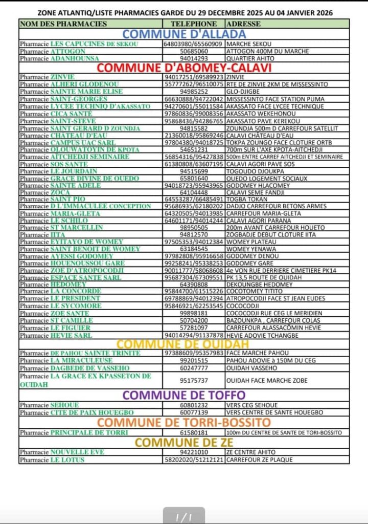 PROGRAMME DE GARDE (ATLANTIQUE) DU 29 DECEMBRE 2025 AU 04 JANVIER 2026