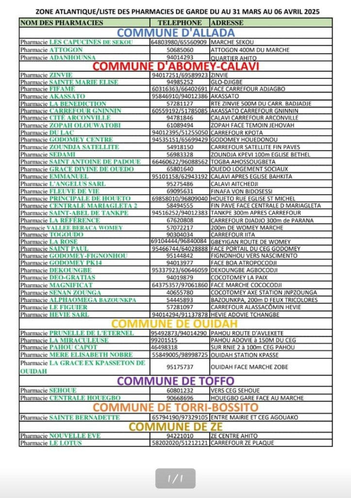 PROGRAMME DE GARDE (ATLANTIQUE) DU 31 MARS AU 06 AVRIL 2025