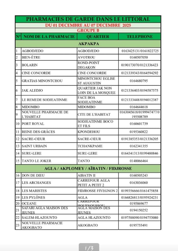 PROGRAMME DE GARDE (LITTORAL) DU 01 AU 07 DECEMBRE 2025