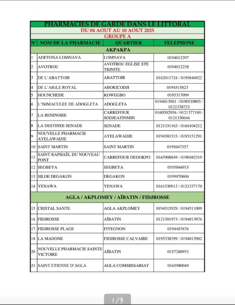 PROGRAMME DE GARDE (LITTORAL) DU 04 AU 10 AOUT