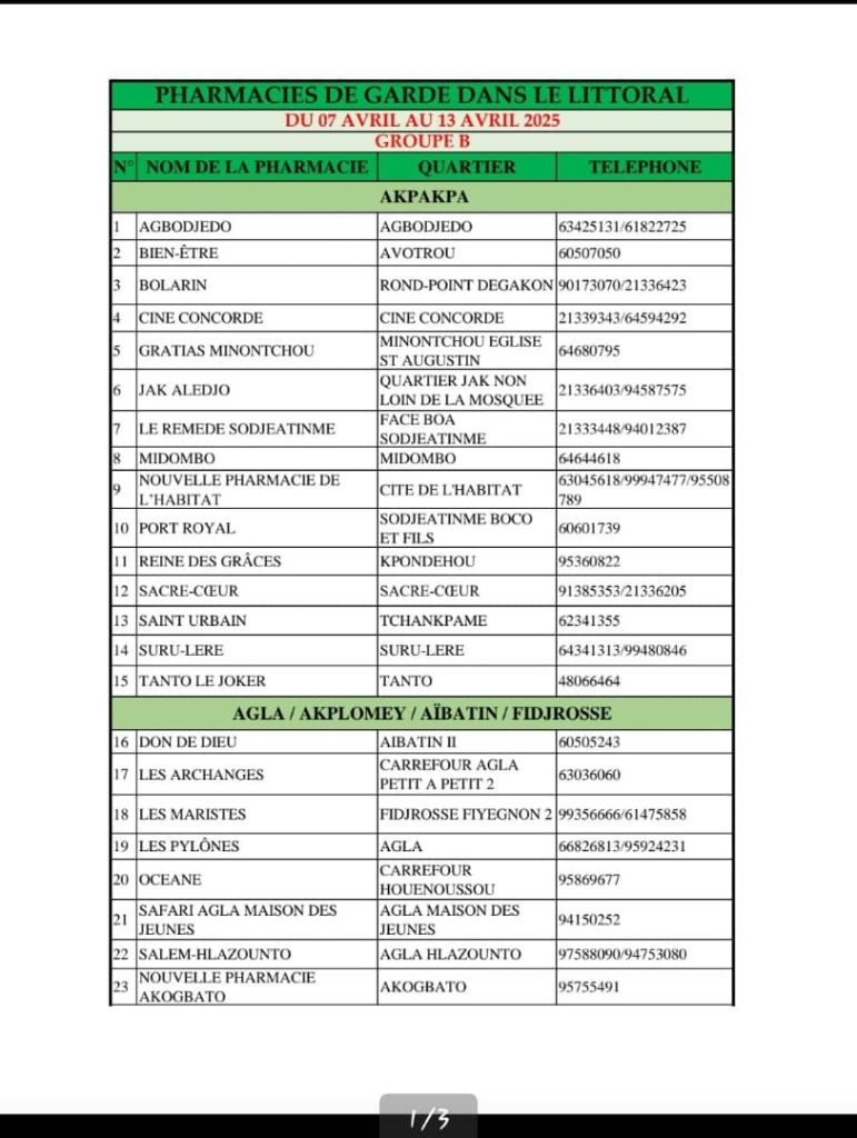 PROGRAMME DE GARDE (LITTORAL) DU 07 AU 13 AVRIL 2025