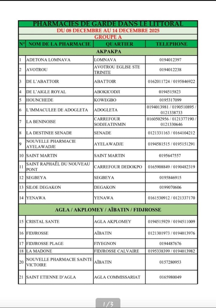 PROGRAMME DE GARDE (LITTORAL) DU 08 AU 14 DECEMBRE 2025