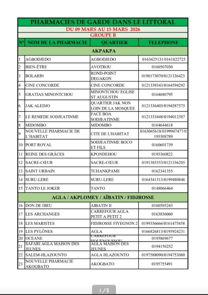 PROGRAMME DE GARDE (LITTORAL) DU 09 AU 15 MARS 2026