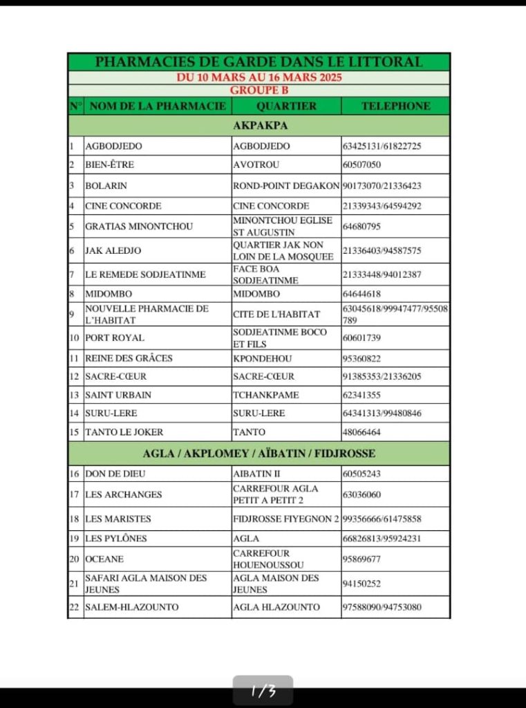 PROGRAMME DE GARDE (LITTORAL) DU 10 AU 16 MARS 2025