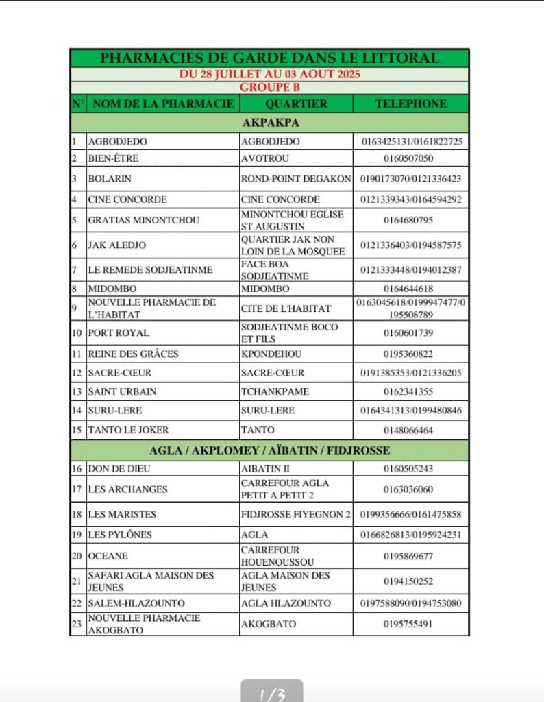 PROGRAMME DE GARDE (LITTORAL) DU 28 JUILLET AU 03 AOUT