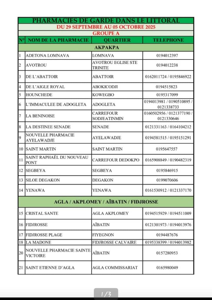 PROGRAMME DE GARDE (LITTORAL) DU 29 AU 05 OCTOBRE 2025