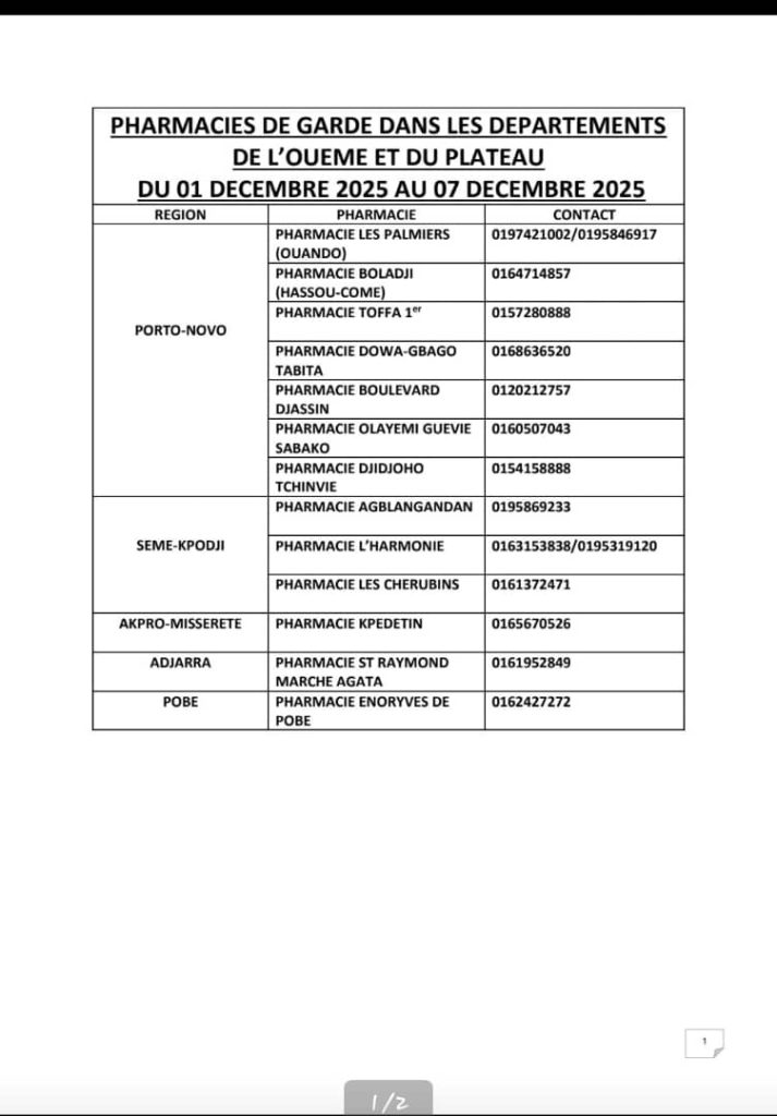 PROGRAMME DE GARDE (OUEME/PLATEAU) DU 01 AU 07 DECEMBRE 2025