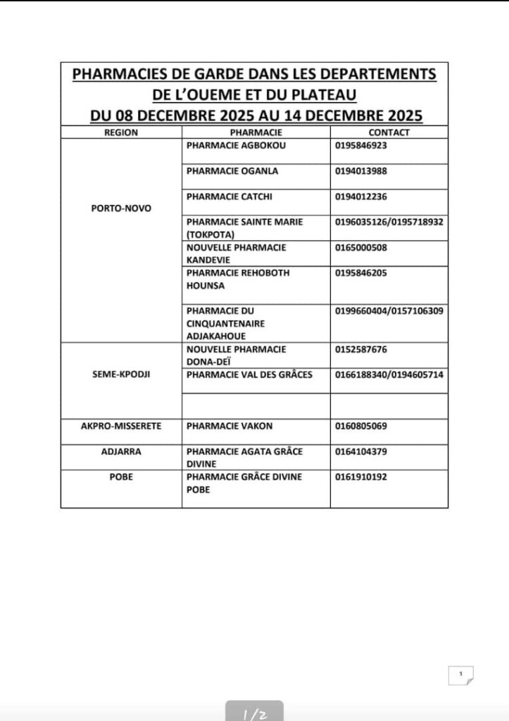 PROGRAMME DE GARDE (OUEME/PLATEAU) DU 08 AU 14 DECEMBRE 2025