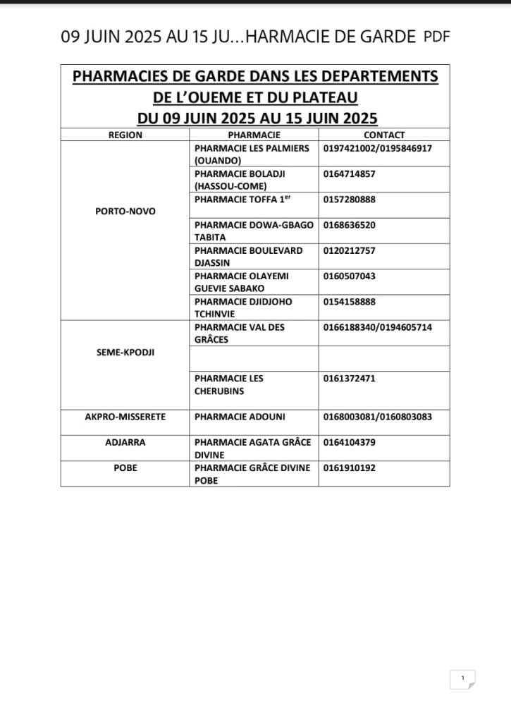 PROGRAMME DE GARDE (OUEME/PLATEAU) DU 09 AU 15 JUIN