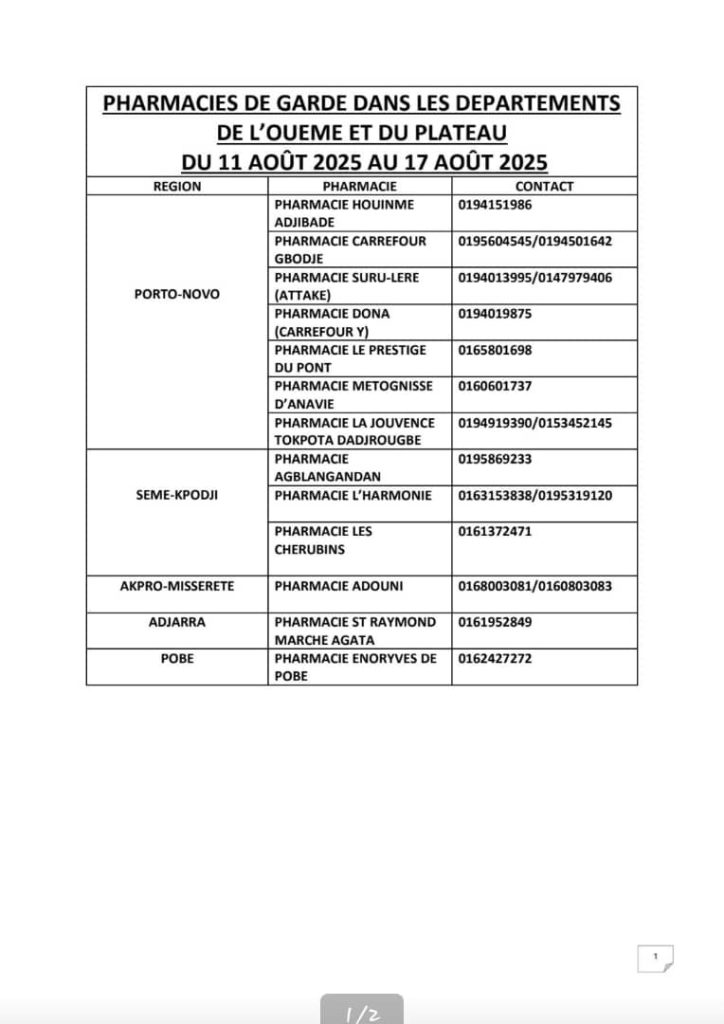 PROGRAMME DE GARDE (OUEME/PLATEAU) DU 11 AU 17 AOUT