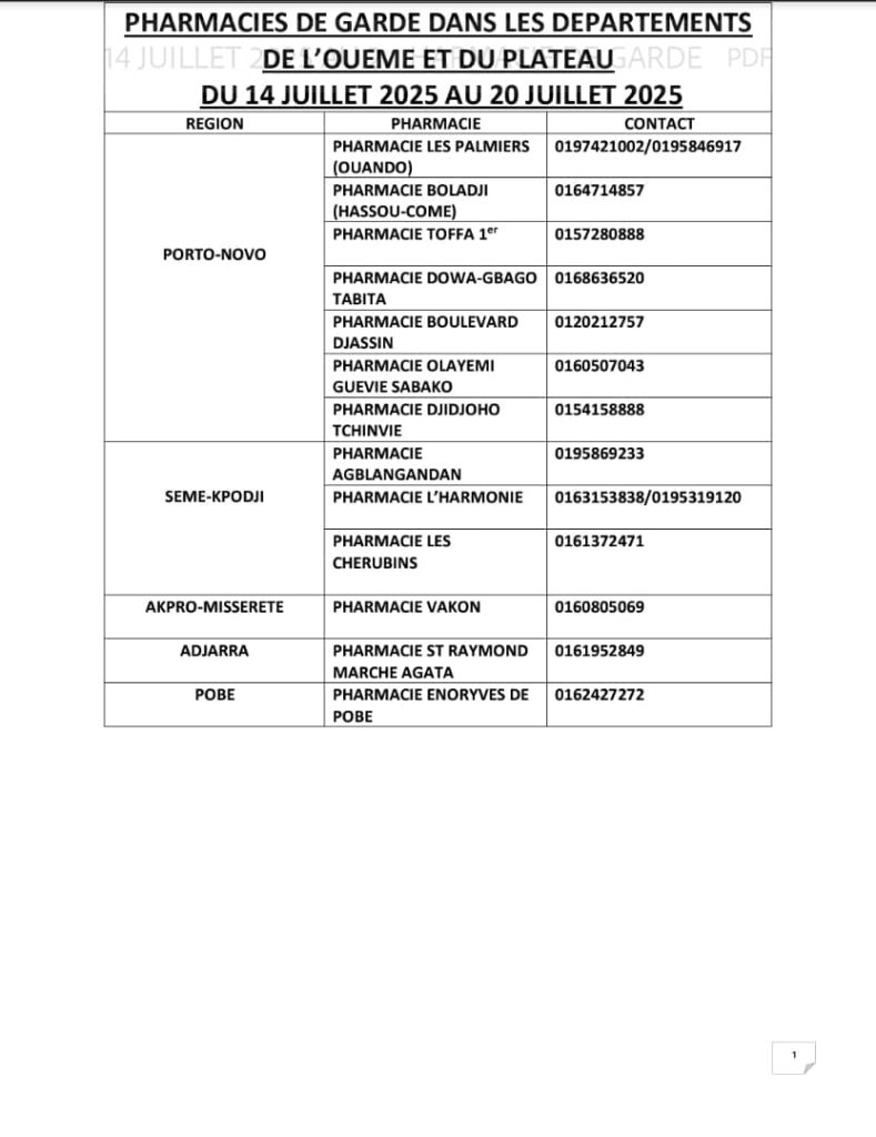 PROGRAMME DE GARDE (OUEME/PLATEAU) DU 14 AU 20 JUILLET