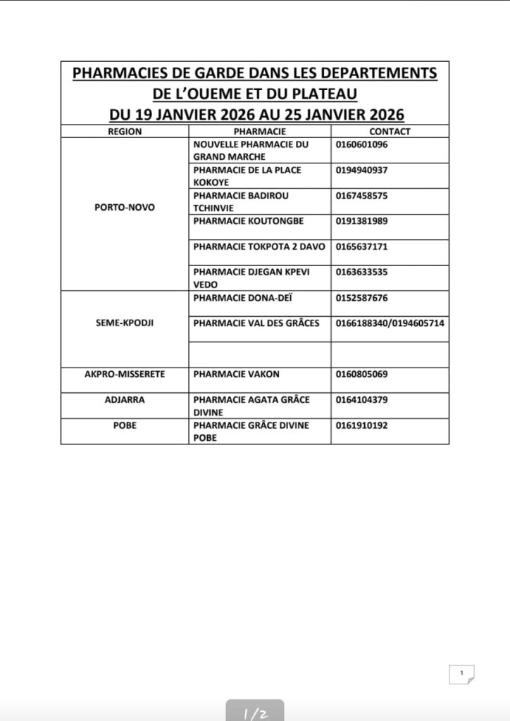 PROGRAMME DE GARDE (OUEME/PLATEAU) DU 19 AU 25 JANVIER 2026o