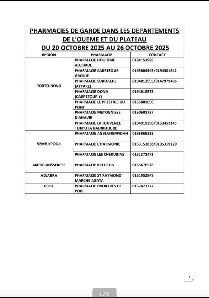 PROGRAMME DE GARDE (OUEME/PLATEAU) DU 20 AU 26 OCTOBRE 2025