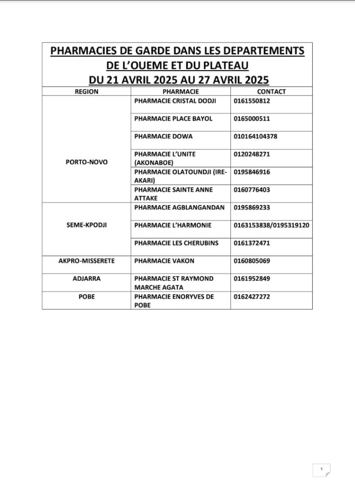 PROGRAMME DE GARDE (OUEME/PLATEAU) DU 21 AU 27 AVRIL