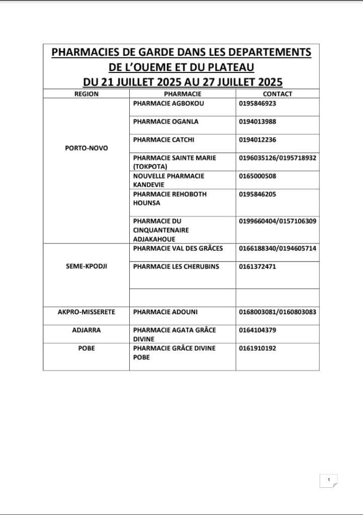 PROGRAMME DE GARDE (OUEME/PLATEAU) DU 21 AU 27 JUILLET