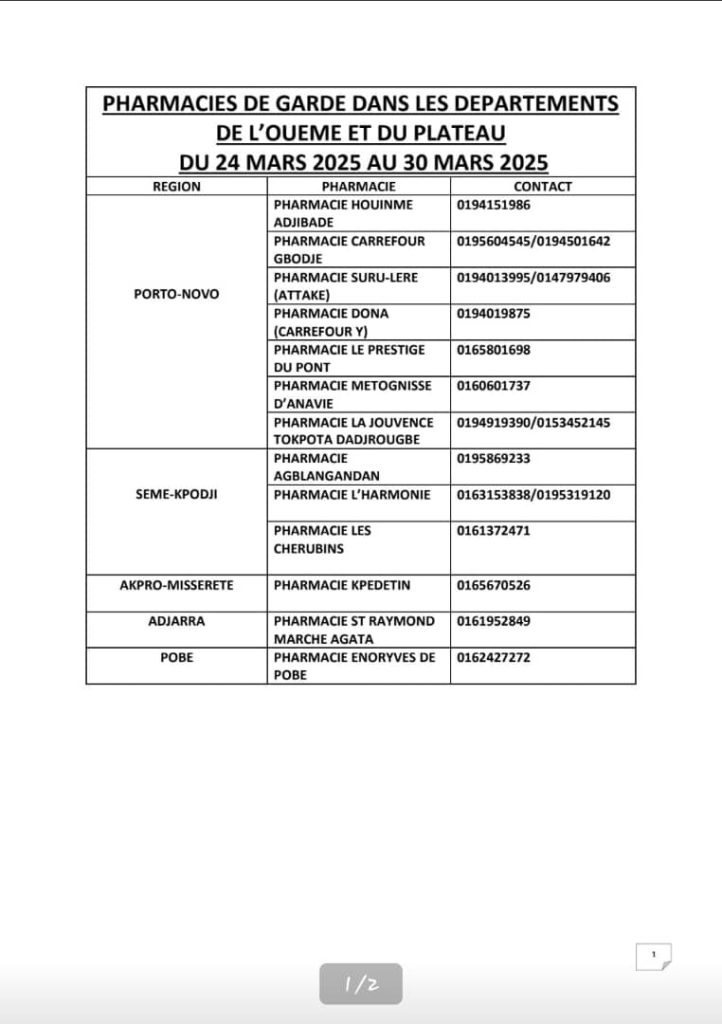 PROGRAMME DE GARDE (OUEME/PLATEAU) DU 24 AU 30 MARS 2025