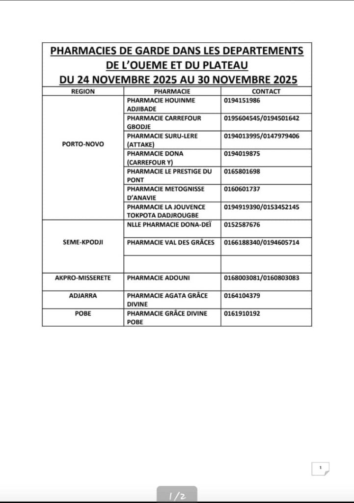 PROGRAMME DE GARDE (OUEME/PLATEAU) DU 24 AU 30 NOVEMBRE 2025