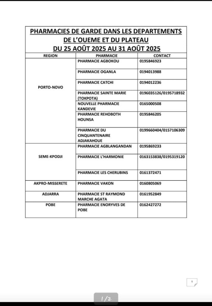 PROGRAMME DE GARDE (OUEME/PLATEAU) DU 25 AU 31 AOUT