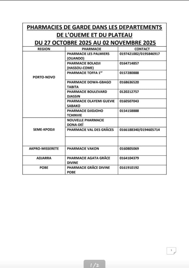 PROGRAMME DE GARDE (OUEME/PLATEAU) DU 27 OCTOBREAU 02 NOVEMBRE 2025