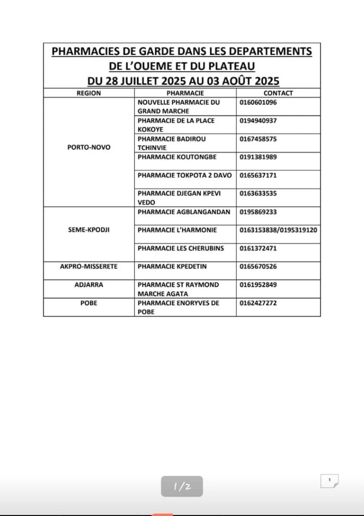 PROGRAMME DE GARDE (OUEME/PLATEAU) DU 28 JUILLET AU 03 AOUT