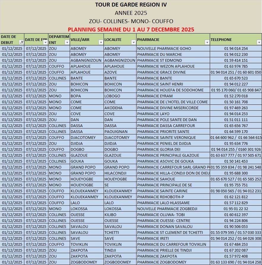 PROGRAMME DE GARDE (ZOU/COLLINES/MONO/COUFFO) DU 01 AU 07 DECEMBRE 2025
