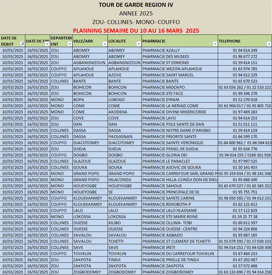 PROGRAMME DE GARDE (ZOU/COLLINES/MONO/COUFFO) DU 10 AU 16 MARS 2025