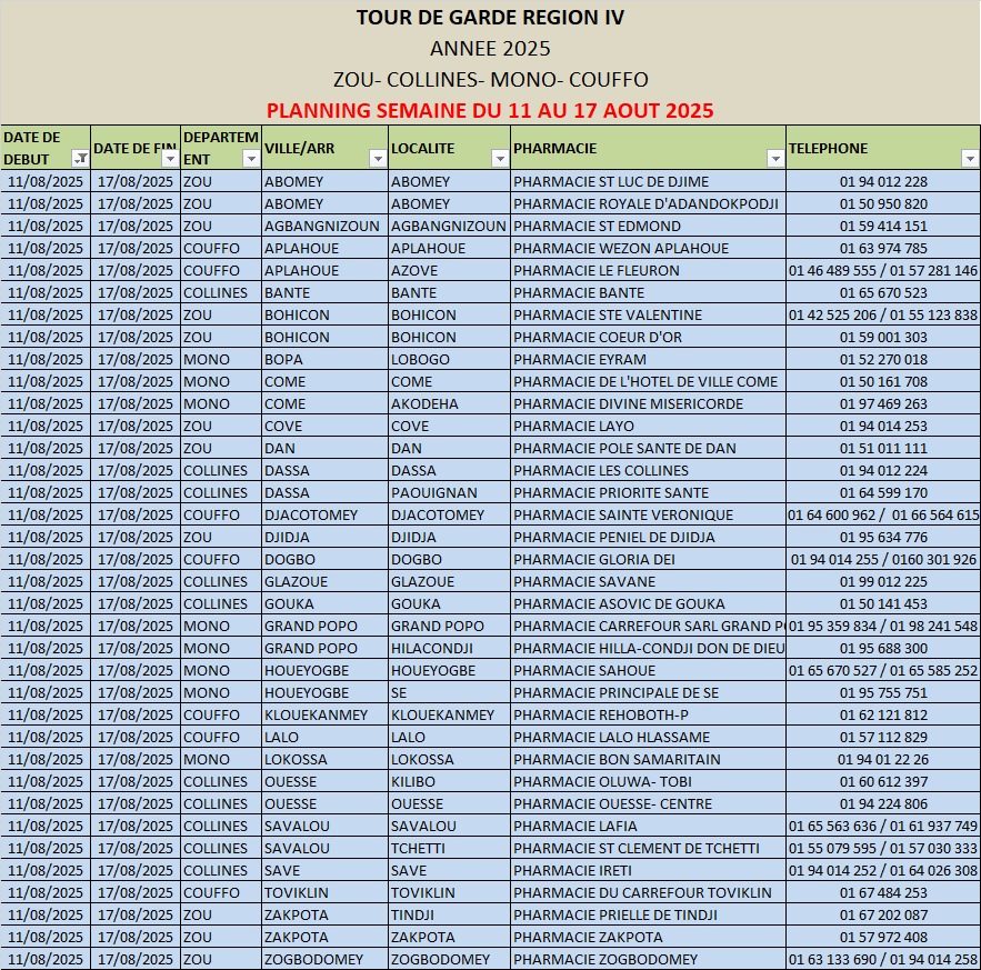 PROGRAMME DE GARDE (ZOU/COLLINES/MONO/COUFFO) DU 11 AU 17 AOUT