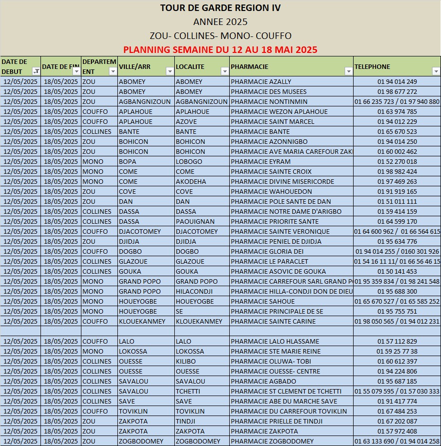 PROGRAMME DE GARDE (ZOU/COLLINES/MONO/COUFFO) DU 12 AU 18 MAI