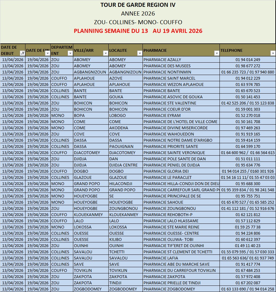 PROGRAMME DE GARDE (ZOU/COLLINES/MONO/COUFFO) DU 13 AU 19 AVRIL 2026