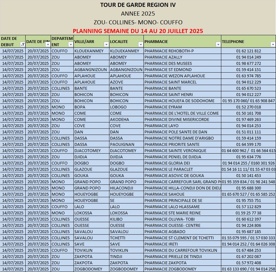PROGRAMME DE GARDE (ZOU/COLLINES/MONO/COUFFO) DU 14 AU 20 JUILLET