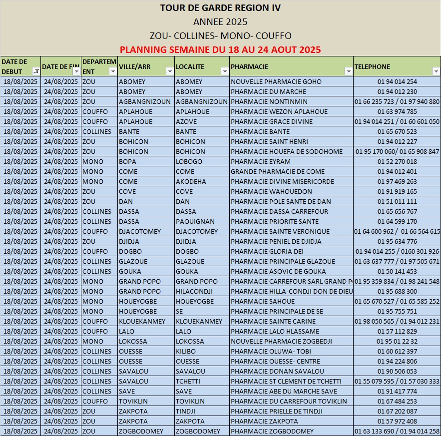 PROGRAMME DE GARDE (ZOU/COLLINES/MONO/COUFFO) DU 18 AU 24 AOUT