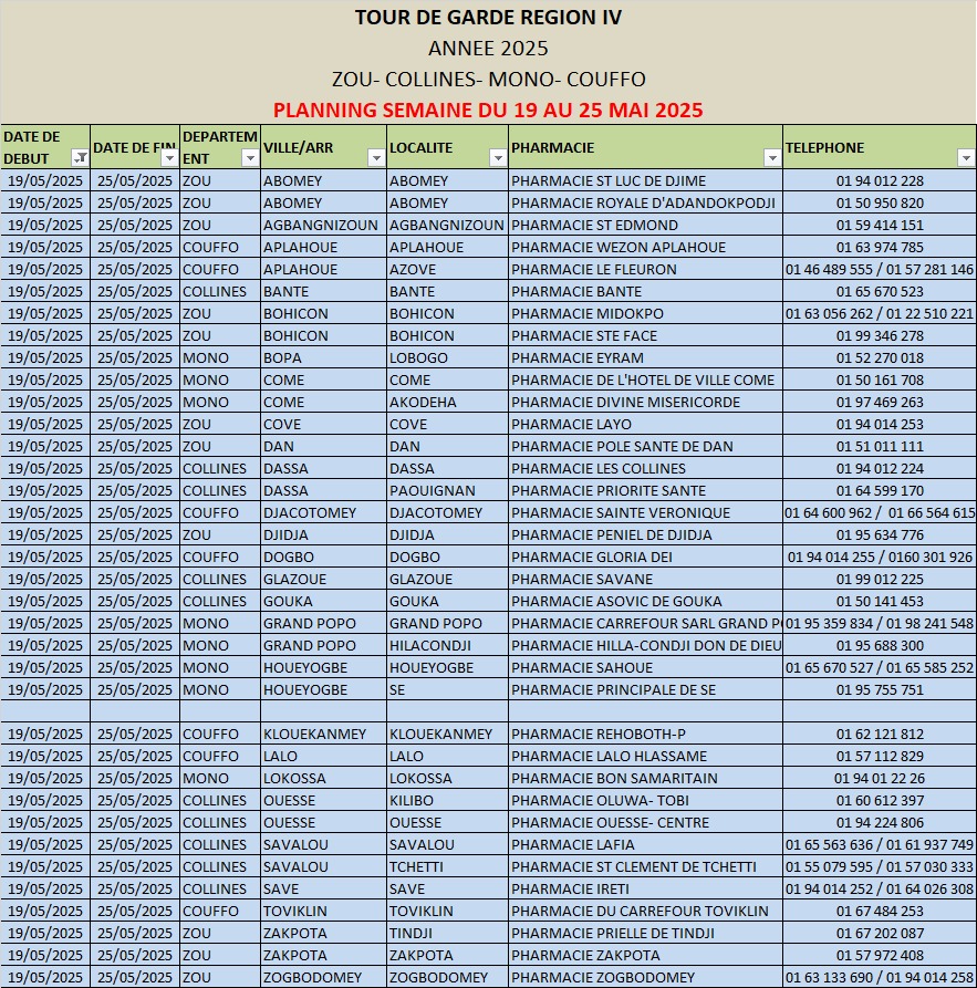 PROGRAMME DE GARDE (ZOU/COLLINES/MONO/COUFFO) DU 19 AU 25 MAI